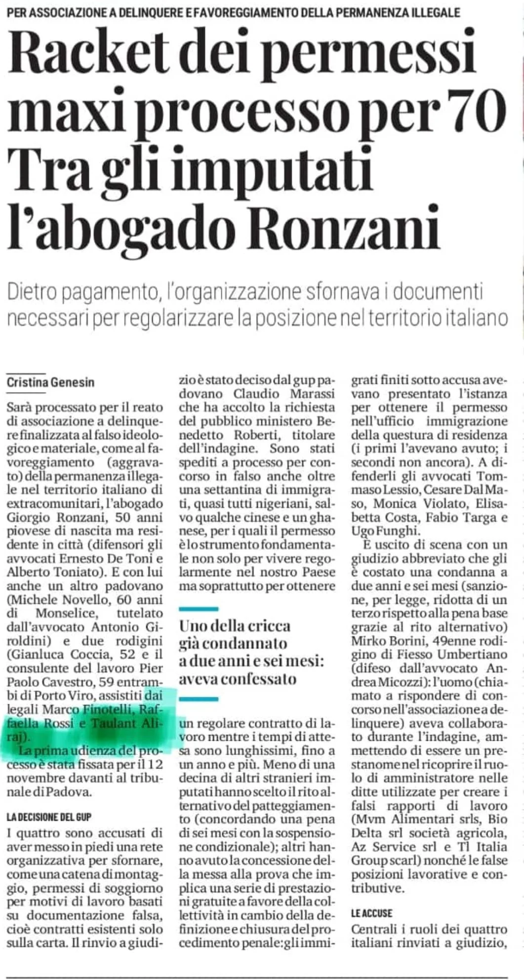 legati alla regolarizzazione di cittadini stranieri. Alla prima udienza, tra i legali difensori figura